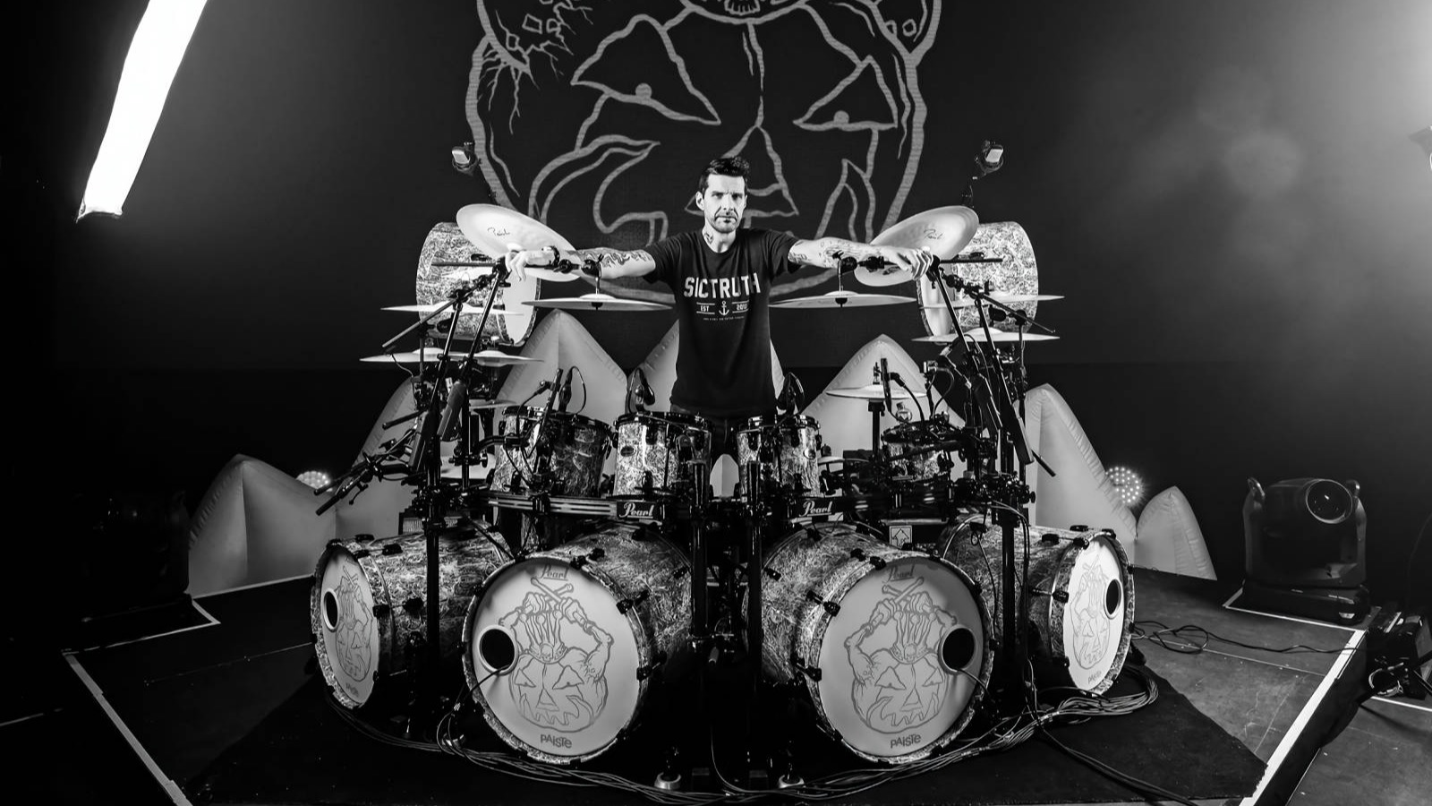 Nachdem ich jahrelang meine Lieblings-Drummer mit Logos auf den Fellen gesehen hatte, entschloss ich mich im Jahr 2002 dazu mein Logo auf meine Bass Drum Front Felle zu bringen, gesagt getan. Natürlich hatte ich noch keine Ahnung, wie ich das machen soll und habe erst einmal mit verschiedenen Technikenrumexperimentiert und dabei auch einige Felle „zerlegt“.